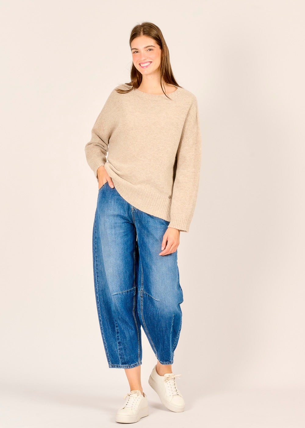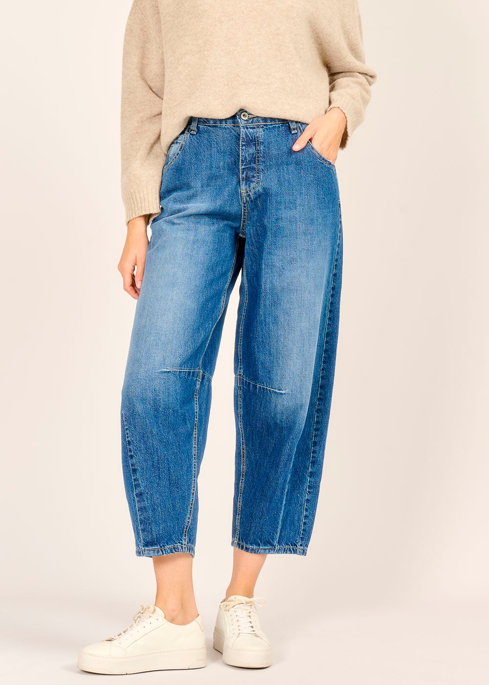 Die Jeans von PLEASE in der Farbe Blu ist ein absolutes Fashion-Statement für einen lässigen und trendigen Look. Ihr besonderer Schnitt ist das Highlight: Oben schmal geschnitten, wird sie zum Bein hin weit und läuft am Knöchel wieder schmal zu. Dieser sogenannte Barrel-Schnitt zaubert eine coole Silhouette, die sofort ins Auge sticht. Kombiniere sie mit Sneakers für einen entspannten Alltagsstil oder mit Absatzschuhen für ein urbanes Outfit.