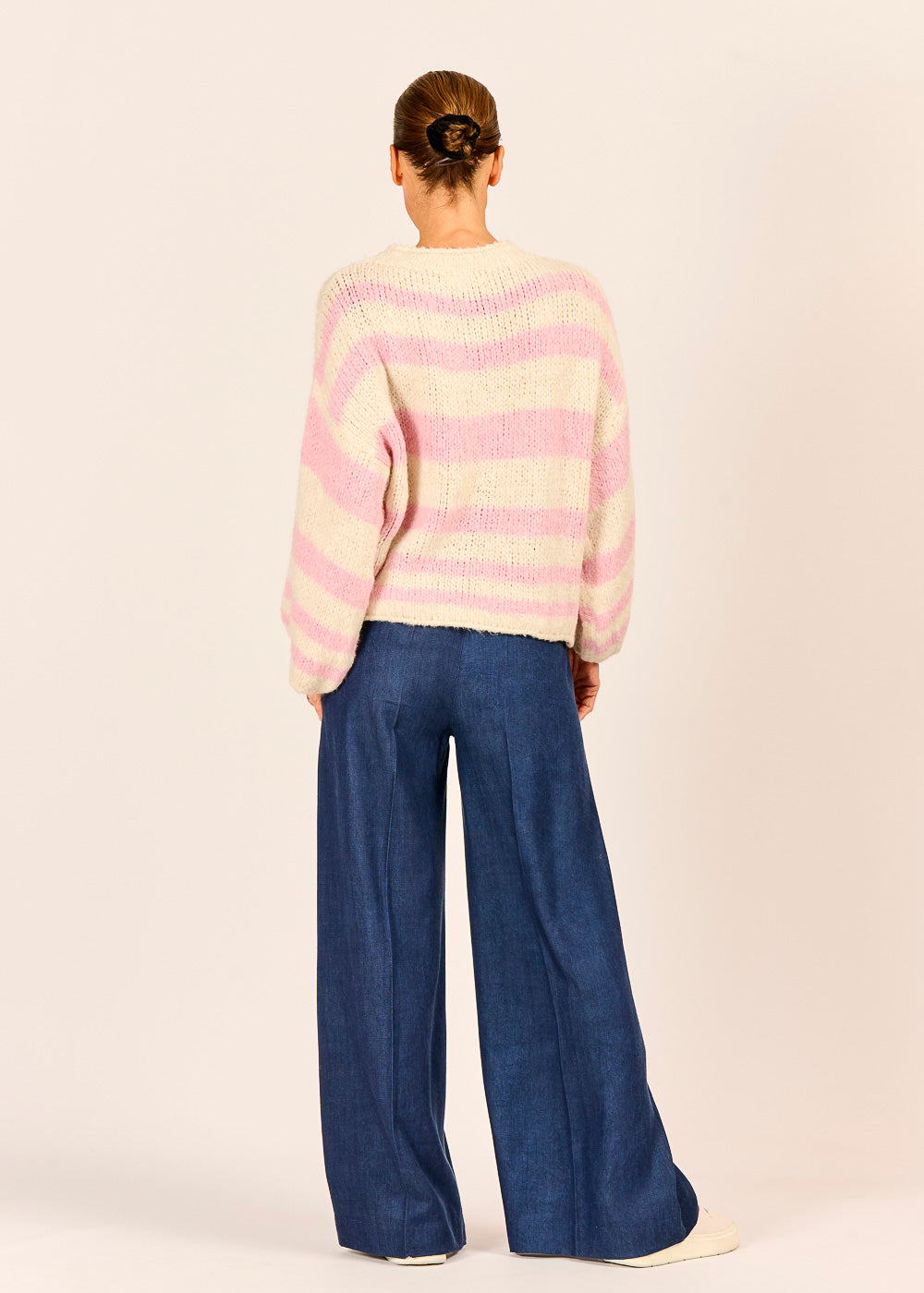 Dieser kuschelige Streifenpullover ist ein charmantes Statement-Piece, das mit einer harmonischen Farbkombination aus hellem Beige (oder Creme) und zartem Rosa besticht. Der grobe Strick und der lockere Schnitt sorgen für ein wunderbar weiches und komfortables Tragegefühl. Ein perfektes Basic, das lässige Denim-Looks sofort mit einem Hauch von Frische und Verspieltheit belebt.